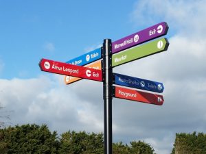 Wayfinding signs also contribute to safety and compliance. Emergency exit signs, evacuation diagrams, restroom signs, fire extinguisher indicators, and restricted area notices play crucial roles in keeping people safe. In emergency situations, people need fast and clear information — and wayfinding signs help direct them efficiently. Regulatory safety signage must meet specific standards regarding color, letter height, placement, and readability. These signs protect businesses from liability while creating a secure environment for employees and visitors.